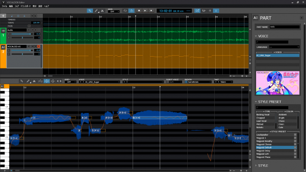 オーディオトラックに入力済みのオーディオデータをウェーブエディターで開き、VOCALO CHANGERでAI UNA(Sugar・Spicy)を選択すれば、AI UNA(Sugar・Spicy)の声で再現されます。