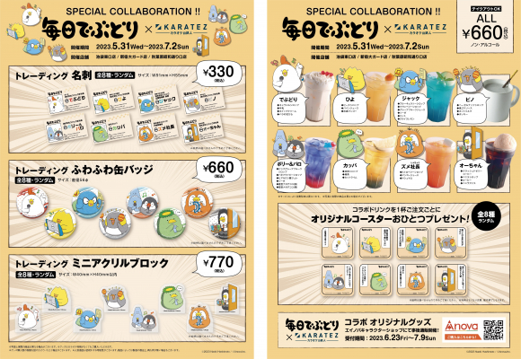 今回のコラボでは、でぶどりたちが「カラオケあるある」を体現したイラストを描き下ろし。そのイラストを使ったグッズも販売されます。また、キャラクターをイメージしたコラボドリンクも販売。コラボドリンクを1杯ご注文ごとにオリジナルコースターをランダムで1点プレゼント!グッズは6月23日よりエイノバキャラクターショップで通販も実施したします。でぶどりたちとカラオケを楽しもう!
