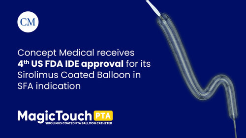 Concept Medical’s fourth IDE approval for the MagicTouch Sirolimus Coated Balloon is granted for the treatment of Superficial Femoral Artery Disease (SFA)