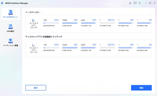 次に、複製されたディスクの効果を示すプレビューインターフェイスが表示されます。 プレビューが正しいことを確認したら、「開始」ボタンをクリックしてクローン作成操作を開始します。