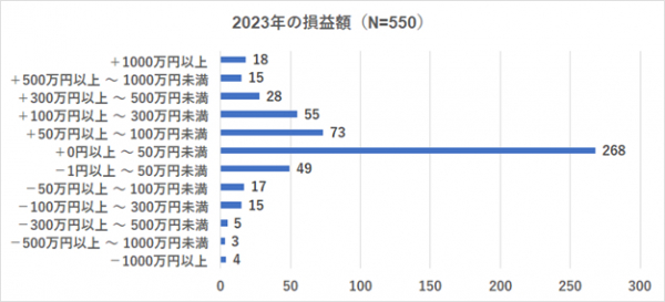 また、損益額の内訳をみると、50万円未満の利益が268人(48.7%)と最多で、続いて50万円以上100万円の人が73人(13.3%)、100万円以上300万円未満の人が55人(10.0%)でした。