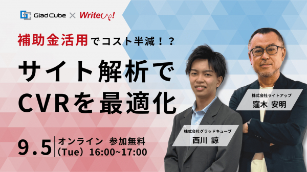 株式会社グラッドキューブ(本社:大阪市中央区 代表取締役 CEO 金島 弘樹 以下:グラッドキューブ)は、株式会社ライトアップ(本社:東京都渋谷区 代表取締役:白石 崇)と共催で9月5日(火)16時より「補助金活用でコスト半減!? サイト解析で CVR を最適化」をテーマに、補助金を活用してデジタルマーケティングを成長させる方法について解説いたします。