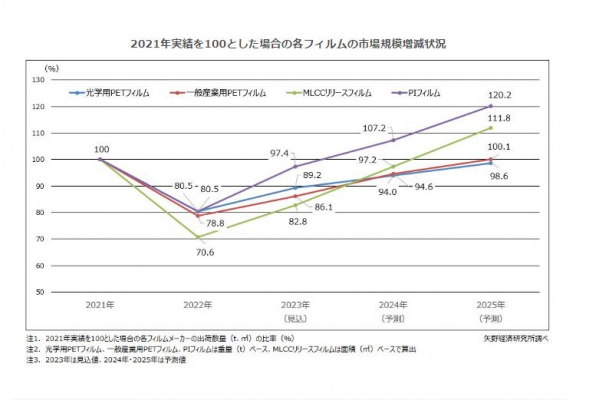 2021年実績を100とした場合の2024年の出荷数量予測は、PIフィルムが107.2%、MLCCリリースフィルムは97.2%、一般産業用PETフィルム94.6%、光学用ペットフィルム94.0%と、2021年の需要レベルに戻るのは2024年から2025年頃になる見通しである。