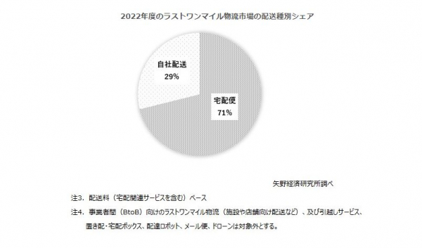 2022年度のラストワンマイル物流市場規模に占める割合は、約7割が「宅配便」による配送(宅配便事業者への委託)、約3割が「自社配送」と推計した。