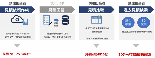 QUANTOは見積を一括で依頼したり、取得した見積書をデータベース化するためのクラウドサービスです。加えて、見積依頼の情報や3D CADデータを検索元として過去見積書を検索できます。バイヤー(調達/購買)の皆様が抱える「見積依頼」「見積管理」「見積検索」に関する課題を解決することで、バイヤー工数削減に加え、サプライヤー選定、適正価格把握、原価企画などの業務を支援します。QUANTOの機能を体感していただける3カ月トライアルプランもご用意しております。