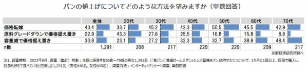 【矢野経済研究所プレスリリース】パンの消費に関する消費者アンケート調査を実施(2023年) パンの値上げ方法は若年層ほど容量減を望まず、高齢層ほど原料グレードダウンを望まない傾向