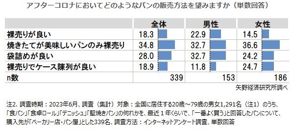全体では、「焼きたてが美味しいパンのみ裸売り」が34.8%で、「袋詰めが良い」が28.0%、「裸売りでケース陳列が良い」が18.9%、「裸売りが良い」が18.3%となった。