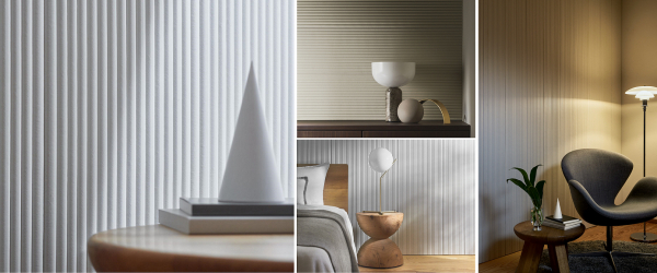 本内装壁面建材は、時代を問わず人気のあるリブ柄の壁面材です。木製の場合、非常に高価格な建材となりますが、本内装壁面建材では価格を抑えることが可能です。本内装壁面建材は、サステナブルでありながら、塩ビクロスの構成材の中で天然素材である炭酸カルシウムとパルプの素材感を活かした愛着がわく建材としてこだわりました。