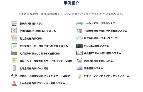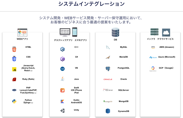 システム開発・スマートフォンアプリ開発・WEBサービス開発・サーバー保守運用などを提供しております。