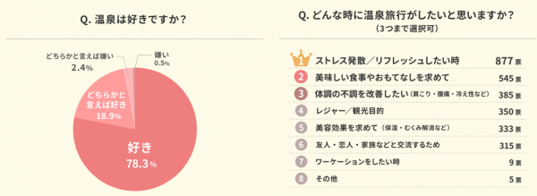 温泉旅行の動機づけとして圧倒的多数の回答を獲得したのは、「ストレス発散/リフレッシュしたい時(877票)」でした。続いて、「美味しい食事やおもてなしを求めて(545票)」と「体調の不調を改善したい(385票)」もそれぞれ2位、3位にランクインしており、この結果から、女性たちが日常生活から解放され転地することや、美味しい料理を食べて、温泉に入浴することなどにより、ストレス発散リフレッシュ、体調不良の改善など、心身の疲れを“癒したい”という欲求があることが伺えます。