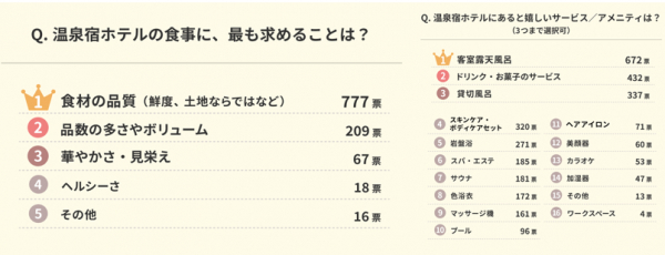 また、重要視するポイントは、他の選択肢に比べて頭1つ抜けた票数を集めた「金額(772票)」「食事(741票)」が1位、2位、続いて「泉質や温浴施設の設備(471票)」「景色・周辺環境など温泉地への魅力(427票)」という結果に。女性が宿ホテルを選ぶポイントは、「金額」や「食事」はもちろん大切なのは理解できますが、意外にも「アクセスの良さ」や「館内のおしゃれ度」よりも「泉質」や「温泉地への魅力」のほうが優先順位は高いようです。