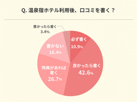 温泉宿ホテルを利用した後に口コミを書くかどうか質問したところ、「悪かったら書く(3.4%)」という回答は極少数であり、「良かったら書く(42.6%)」という回答のほうが圧倒的に多いという結果となりました。