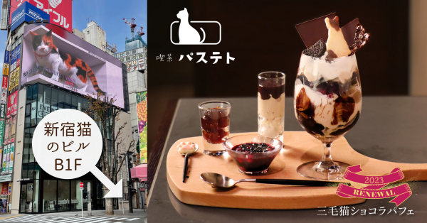 株式会社アズフードシステムズ(本社:東京都中央区、代表取締役:森田威)が運営する、新宿駅東口すぐの喫茶店「喫茶 パステト」は、同店の階上に設置された「クロス新宿ビジョン」の目玉コンテンツである“3D巨大猫(新宿東口の猫)”をテーマにした一番人気のパフェ『三毛猫ショコラパフェ』を大人な味わいに改良し、2023年11月1日(水)よりリニューアル発売いたします。