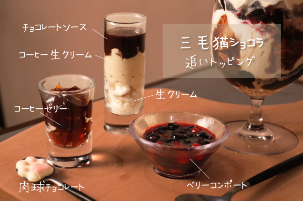 新バージョンの『三毛猫ショコラパフェ』はお値段据え置きで単品1,900円、ドリンクとセットで2,600円(飲み比べ可能なお替りセットは+400円)です(全て税込)。発売日は2023年11月1日(水)を予定しています。