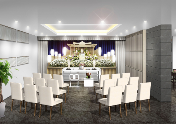 (イメージ画像)会葬人数により柔軟な式場設計が可能な式場。隣接して会食スペースを配置。
