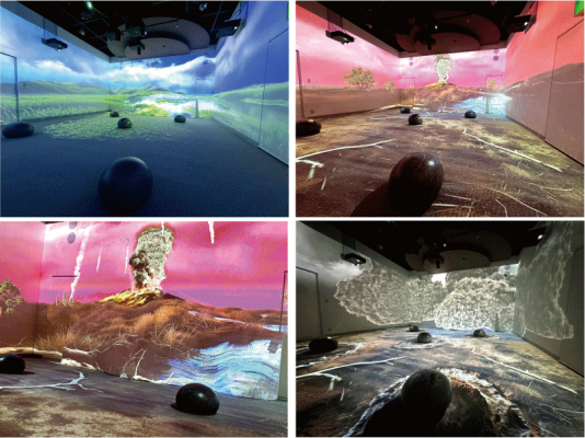 指定位置に人物が近づくことで、地鳴りと共に噴火をCGアニメーションで再現し、二上山と3つの石が二上山の噴火により産出されたことを表現するなど、火山灰の噴出、溶岩流、火山弾の飛散など、3Dホログラム立体造形物や映像として、全体の演出とリアルタイムにシンクロさせることにより、一体感のあるバーチャル体験を実現いたしました。