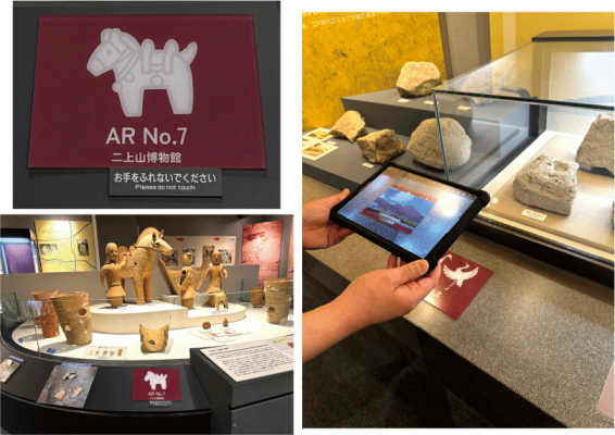 国指定史跡である尼寺廃寺の塔の3DCGモデルを制作し、貸し出しタブレット端末の他、来館者のスマートフォンやタブレット端末等を通して、ARアプリ上で表示いたします。