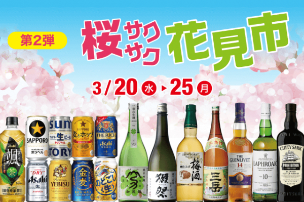 お花見の準備はリカーマウンテンで♪リカーマウンテン各店では、3月20日(水・祝)〜25日(月)の間「桜サクサク花見市セール 第2弾」を開催します