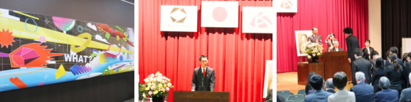 入学式の後、「開学記念式典・パーティー」が開催されました。新入生、保護者と在学生および教職員が一堂に会し、親睦を深めました。新入生は在学生との対話を通し、共に学び成長するコミュニティの一員として、サークルやクラブ活動への関心を高める機会となりました。総務学生部長の高嶋教授より大学ロゴの紹介がありました。会場装飾に、メディアデザイン部のタペストリーや華道部のいけばなを展示しました。