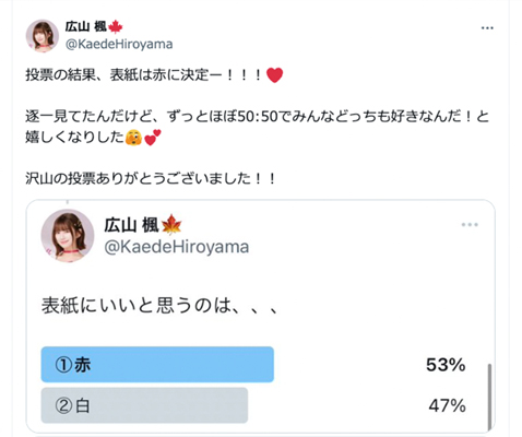 さらに、写真集の表紙については、最終候補となった2枚の写真を発売前にあえて公開し、SNSのアンケート機能を利用した一般投票で表紙が決定しました。