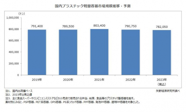 【矢野経済研究所プレスリリース】プラスチック軽量容器市場に関する調査を実施(2024年)〜2023年の国内出荷量は前年比98.9%の78万2,050tで着地の見込、消費者に節約志向、足踏み続く見通し〜