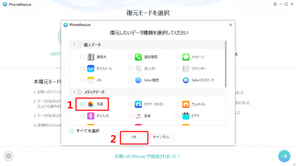 Step5、リカバリーしたい写真を選択して、「iPhone」を復元してください。