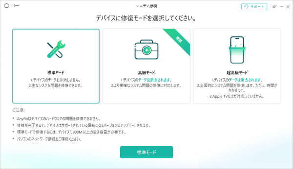 ステップ4 AnyFixには、iOSの問題を修復するための三つのモードが用意されています。「標準モード」は一般的な問題に対応して、「高級モード」は深刻な問題が解決でき、「超高級モード」はデータを保持しながらデバイスを完全に初期化することができます。これにより、ユーザーは具体的な状況に応じて最も適切な修復方法を選べます。