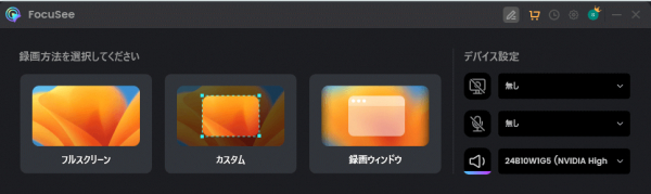 Step 2 FocuSeeを開き、フルスクリーン、カスタム、録画ウィンドウ含む録画モードを選択します。