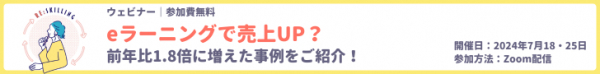 この度、ウェビナー「eラーニングで売上UP?前年比1.8倍に増えた事例をご紹介!」(参加費無料)を、2024年7月18日(木)、7月25日(木)に開催いたします。