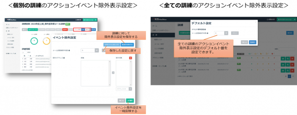 MicrosoftやGoogleによる標的型攻撃メールに対するセキュリティ強化により、メールチェックシステムによるアクションイベントが記録されることが多く、メールチェックシステムと訓練対象者のアクションイベントが分かりにくくなってきています。メールチェックは、訓練メール受信後30秒から60秒以内に実施されるケースも多く、メール送信後除外秒数を設定して全ての訓練に反映することや個別の訓練にメール送信後除外秒数やIPアドレスを設定し、メールチェックシステムのアクションイベントを除外表示することができます。全ての訓練に設定した場合と個別の訓練に設定した場合は、個別の訓練の設定を優先して集計します。訓練実施中(後)の訓練結果画面で、アクションイベント除外表示を反映するしないの切替えも簡単に実施できます。