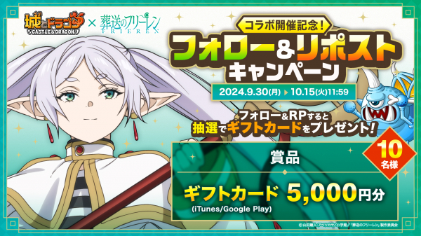 9月30日(月)より、「コラボ開催記念!フォロー&リポストキャンペーン」を実施いたします。『城とドラゴン』公式X(旧Twitter)アカウントをフォローし、対象ポストをリポストしていただいた方の中から抽選で10名様に、ギフトカード(iTunes/Google Play)をプレゼントいたします。