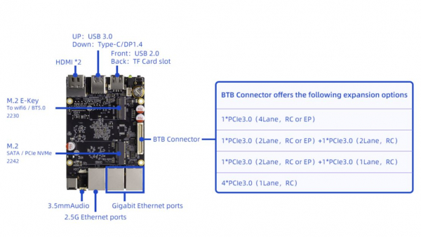 ・ その他のインターフェース: BTBコネクタ (2×PCIe3.0 (4レーン), 2×UART, 1×USB2.0, 1×CAN, 1×SARADC, GPIO)