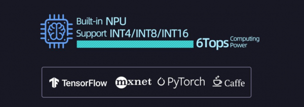 6TOPSのNPUは、INT4/INT8/INT16の混合演算に対応し、TensorFlow、MXNet、PyTorch、Caffeといったフレームワークでの運用が可能です。これにより、高度なエッジコンピューティングを必要とする端末向けの性能を提供します。