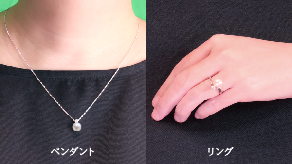 ジュエリーラインは、ペンダント、リング、イヤリング、ピアスの4種類で、いずれも、アコヤ真珠は、テリの美しい約7.5mm珠のラウンド型、ホワイトピンク系の片穴タイプを使用しております。