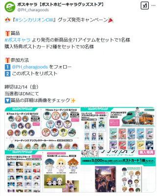 「ポスキャラ」のXアカウントでは、「ポスキャラより発売するTVアニメ『シンカリオン チェンジ ザ ワールド』新商品全71アイテムをセットで1名様」、「購入特典ポストカード2種をセットで10名様」にプレゼントするキャンペーンを2025年2月14日(金)23:59まで実施中です。