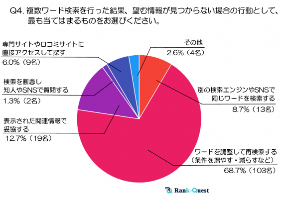 最も多かった行動は「ワードを調整して再検索する」(68.7%)で、過半数以上の人が条件を増減したりキーワードを入れ替えたりしながら、再度検索を試みていることがわかります。