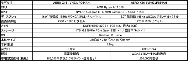 GIGABYTE、Ryzen AI 7 350とGeForce RTX 5060を搭載した薄型・軽量16.0型AIノートPC「AERO X16シリーズ」を発売