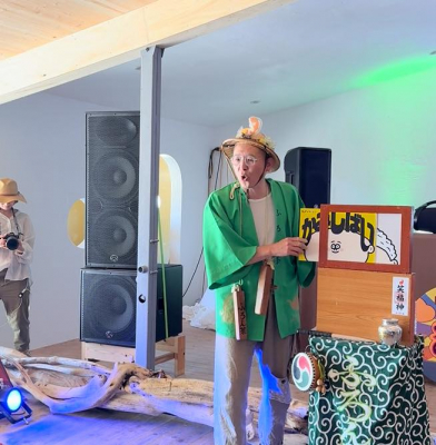 ふろん茶は、北部九州訛りで全国を巡る紙芝居師。半導体装置設計や介護職の経験を経て、2021年に紙芝居屋のガンチャンと出会い、師事しています。