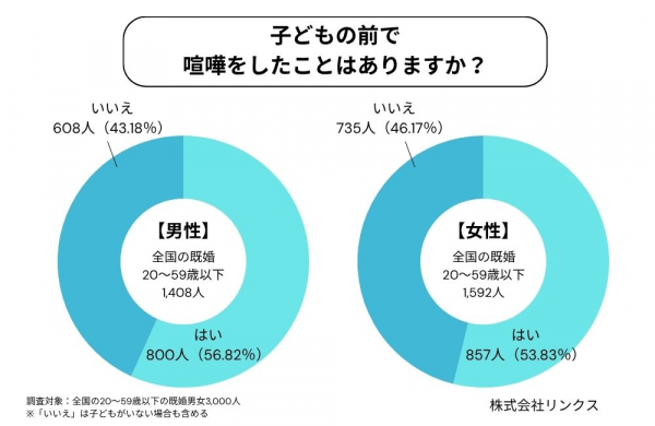 調査の結果、既婚男女の55.23%が「子どもの前で夫婦喧嘩をした経験あり」と回答。