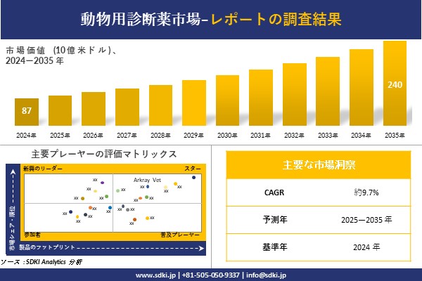 SDKI Analytics(本社:東京都渋谷区)は、このたび、2025年07月16に「動物用診断薬市場調査レポート:2025−2035年の市場規模、シェア、傾向の予測」を発表しました。動物用診断薬に関する市場調査レポートには、統計的及び分析的アプローチを使用した予測評価が含まれています。この調査レポートでは、一次及び二次調査方法を使用して分析された主要な業界洞察を通じて将来の傾向を理解できるようにすることで、主要な市場動向を読者に説明しています。