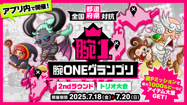 2025年7月18日(金)6:00より、「全国都道府県対抗腕ONEグランプリ 予選2ndラウンド[トリオ大会]」をアプリ内で開催いたします。予選は全『城ドラ』ユーザーが参加可能!今回はアプリ内で現在お住いの都道府県を自己申告し、バトルに挑んでいただく形となります。上級者VS初心者でも選択できるキャラ数や育成による差がなく戦える“腕ONEグランプリ”モードでのバトル。挑むほど達成でき、最大1,000ルビーや育成アイテムなど報酬がたっぷりもらえる「腕Pミッション」も同時開催!みなさまのご参加をお待ちしております。