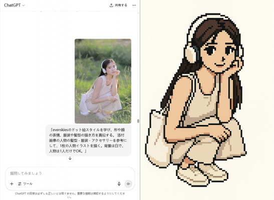 ChatGPTの画像生成機能を活用すれば、簡単に「everskies風のドット絵」スタイル画像が作成できます。画像をアップロードして、プロンプトを入力するだけで、あなた好みのピクセルキャラが完成します。
