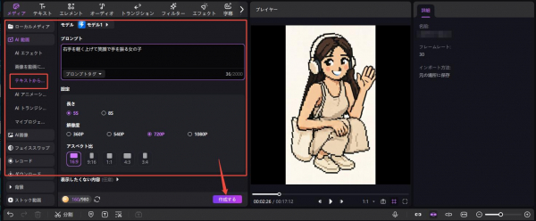 2. 先ほど生成したピクセルキャラ画像を読み込み、「手を軽く上げて笑顔で手を振る女の子」など、シンプルな日本語テキストで動きを指示します。