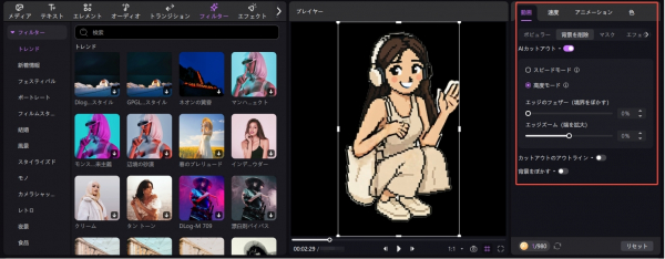 3. 動画が生成されたら、右側のツールバーから「動画」→「背景を削除」→「AIカットアウト」を選択します。自動的に背景が除去され、キャラクターだけの動画素材が完成します。