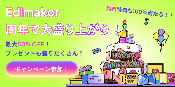 本記事は、「HitPaw Edimakor」1周年記念キャンペーンにあわせてご紹介しています。今なら、ケーキ点灯チャレンジで無料体験カードや豪華特典がもらえるチャンスも!
