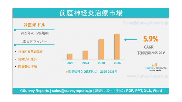 Surveyreportsの専門家による前庭神経炎治療市場の調査によれば、2025年における市場規模は27億米ドルであった。また、2035年末までに市場規模は38億米ドルに達すると予測されている。前庭神経炎治療市場は、2025年から2035年の予測期間において、約5.9%の年平均成長率(CAGR)で成長すると見込まれている。