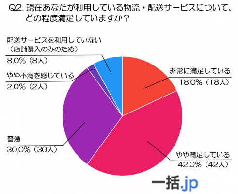 最も多かったのは「やや満足している」で、42.0%(42人)が現在の物流・配送サービスに一定の評価を示しました。