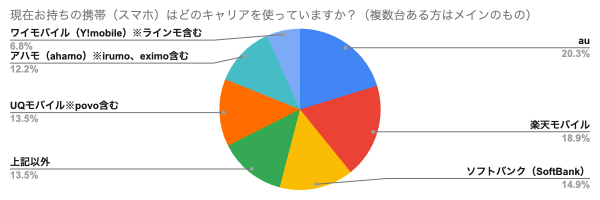 2025年7月時点の格安SIM乗り換えに関する調査の結果、現在利用しているキャリアは「au」が20.3%で最も多く、次いで「楽天モバイル」が18.9%、「ソフトバンク」が14.9%という結果となりました。
