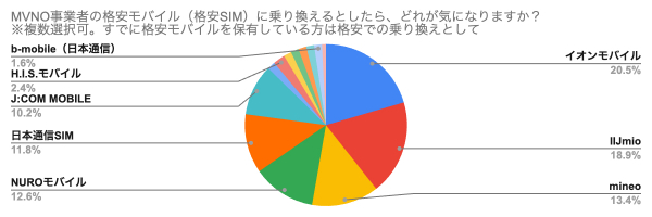 MVNO事業者への乗り換え先として最も多く選ばれたのは「イオンモバイル」で、20.5%のユーザーが気になると回答しました。次いで「IIJmio」が18.9%、「mineo」が13.4%という結果となりました。