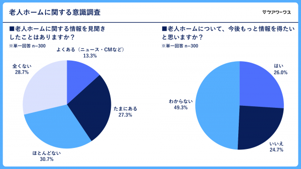 老人ホームについて今後もっと情報を得たいと思いますか?という問いに対しては、「わからない」が49.3%で最も多く、約半数が情報取得への明確な意向を持っていないことがうかがえます。